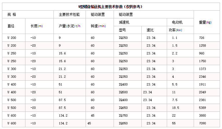 U型螺旋輸送機主要技術參數(僅供參考)