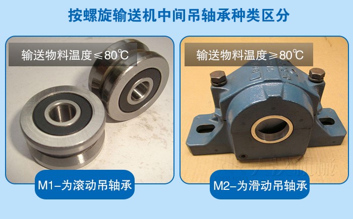 1、M1-為滾動吊軸承,采用80000型密封軸承,軸蓋上另有防塵密封結構,密封效果好,吊軸壽命長。(常用在不易加油,不加油或油對物料有污染的地方,輸送物料溫度≤80℃)
