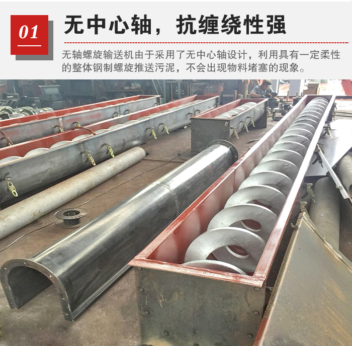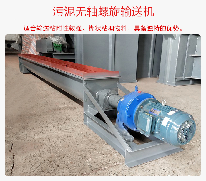 污泥中含有大量的雜質(zhì),使用傳統(tǒng)輸送機(jī)對(duì)其進(jìn)行輸送很容易出現(xiàn)堵料現(xiàn)象,嚴(yán)重影響輸送效率,無(wú)軸螺旋輸送機(jī)由于采用了無(wú)中心軸設(shè)計(jì),利用具有一定柔性的整體鋼制螺旋推送污泥,其抗纏繞性強(qiáng),不會(huì)出現(xiàn)物料堵塞的現(xiàn)象。