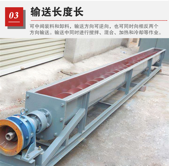 無(wú)軸螺旋輸送機(jī)可以中間裝料和卸料,輸送方向可逆向,也可同時(shí)向相反兩個(gè)方向輸送。輸送過(guò)程中還可對(duì)物料進(jìn)行攪拌、混合、加熱和冷卻等作業(yè),還可以通過(guò)裝卸閘門(mén)調(diào)節(jié)污泥的流量,單機(jī)輸送長(zhǎng)度可以達(dá)到60~70m。