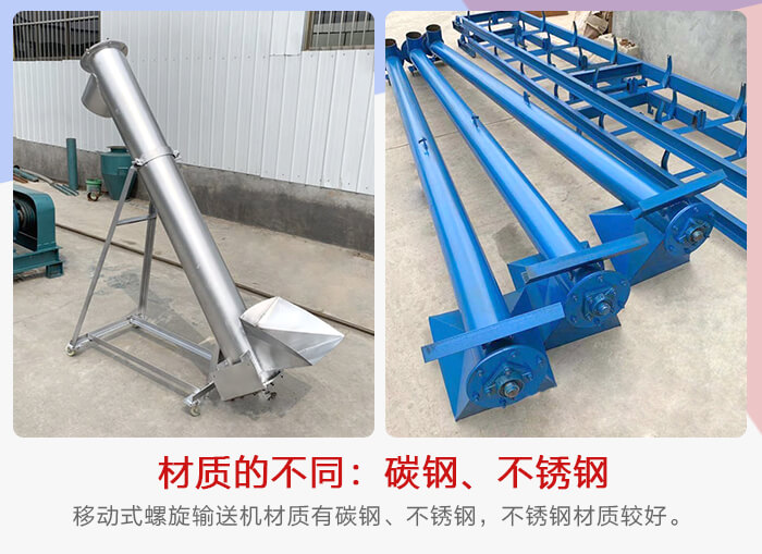 移動(dòng)式螺旋輸送機(jī)材質(zhì)有碳鋼、不銹鋼,不銹鋼材質(zhì)的價(jià)格要貴1倍左右,不銹鋼的主要用于對(duì)輸送環(huán)境要求高的行業(yè),清潔度高,不會(huì)污染物料,使用時(shí)間長(zhǎng),造價(jià)也相對(duì)高。碳鋼材質(zhì)可以主要應(yīng)用在一些對(duì)物料要求不是很嚴(yán)格或?qū)Γ菪斔蜋C(jī)的衛(wèi)生沒(méi)什么特別要求的地方,例如:一些煤炭,石灰,石子等一些顆粒狀的行業(yè)。