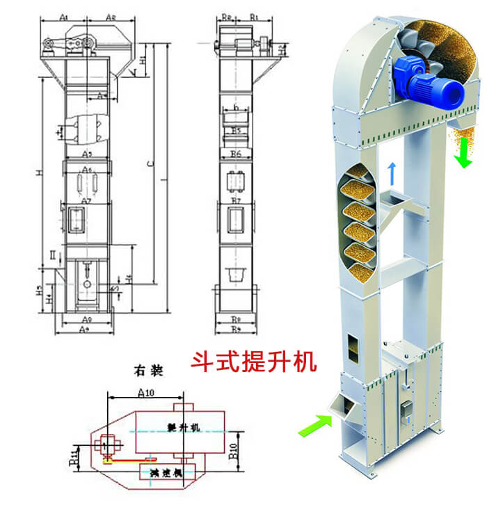 斗式提升機(jī)料斗把物料從下面的儲(chǔ)藏中舀起,隨著輸送帶或鏈提升到頂部,繞過(guò)頂輪后向下翻轉(zhuǎn), 斗式提升機(jī)將物料傾入接受槽內(nèi)。
