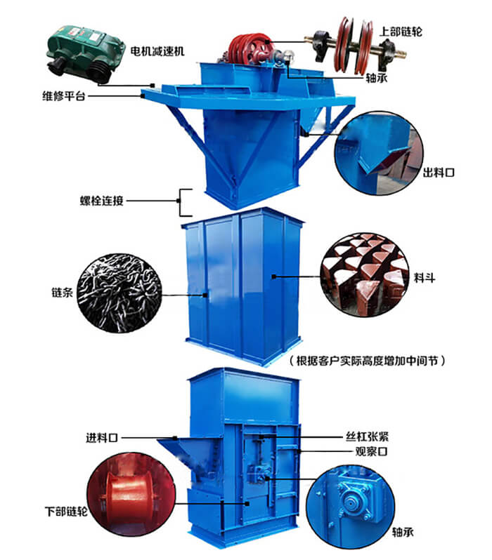 垂直斗式提升機(jī)是利用傳動(dòng)首尾相接的牽引帶,帶動(dòng)多個(gè)小斗運(yùn)動(dòng),從低處向高處輸送物料的設(shè)備。