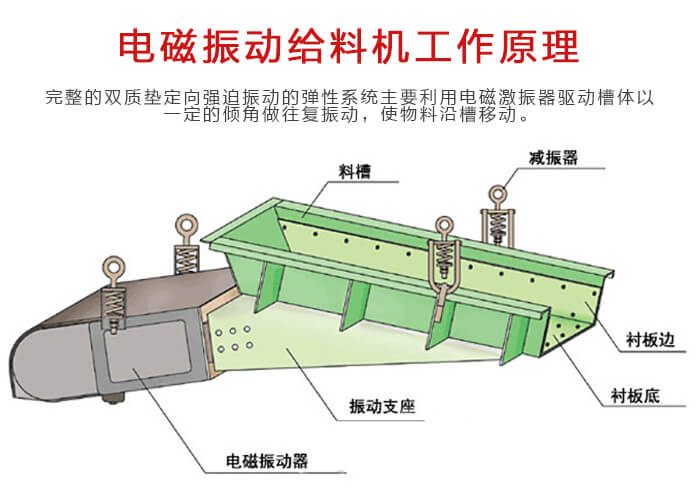 電磁振動給料機(jī)是一個較為完整的雙質(zhì)墊定向強迫振動的彈性系統(tǒng), 整個系統(tǒng)工作在低臨界共振狀態(tài),主要利用電磁激振器驅(qū)動槽體以一定的傾角做往復(fù)振動,使物料沿槽移動。