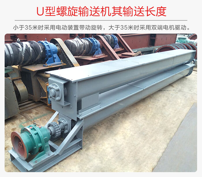 U型螺旋輸送機的輸送長的有兩種,其一:殼體長度小于35m的其螺旋軸是采用一端單電動裝置帶動主軸的旋轉,而當其長度大于35m時就可采用兩端雙電動裝置帶動主軸旋轉。