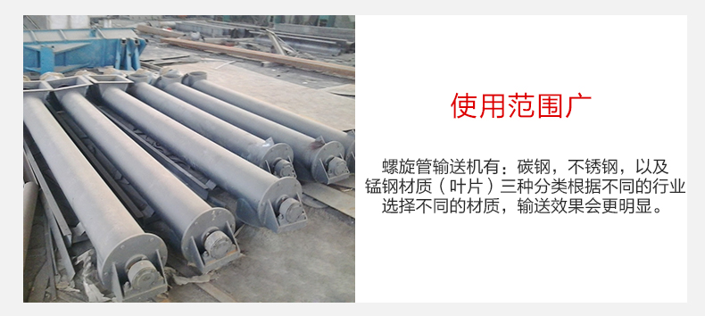3,產品材質可供多個行業(yè)進行選擇,螺旋管輸送機有:碳鋼,不銹鋼,以及錳鋼材質(葉片)三種分類根據(jù)不同的行業(yè)選擇不同的材質,輸送效果會更明顯。